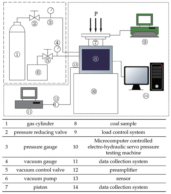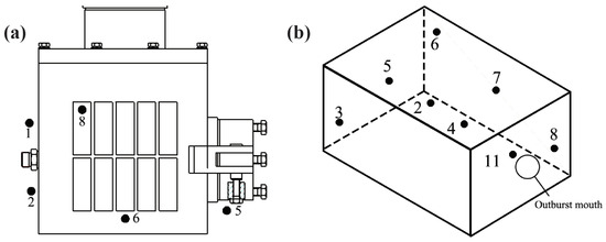 The experimental apparatus is shown in Figure 1, including a pressure loading device, gas loading device, outburst initiation device, landing device, and data collection and analysis device. The pressure loading device consists of a microcomputer-controlled electro-hydraulic servo pressure testing machine. Loading system: YAW4306 microcomputer-controlled electro-hydraulic servo pressure testing machine (Xuzhou, China). The testing machine has a maximum load of , a test force indication resolution (FS) of 1/300,000, a relative error of the test force indication of of the indication value, a loading rate of 600∼60,000, a loading rate accuracy of , and employs both force and displacement control methods. It can perform uniaxial compression, tension, cyclic loading, creep, and other tests. The data collection and analysis device is used to collect various signal features during the coal and gas outburst experiment process. The surface potential data are collected using the LB-IV type multi-channel potential data acquisition system. The LB-IV type multi-channel potential data acquisition system mainly consists of a central controller, data collector, and front-end bridge amplifier. This instrument is equipped with 16 acquisition channels, which can be used simultaneously to connect copper sheet electrodes and strain gauges for measuring surface potential or strain during the deformation and fracture process of coal and rock, with a 16-bit A/D conversion resolution. The sampling frequency is up to for continuous acquisition and up to for fixed-length (200 s) acquisition. EMR and AE data collection use the CTA-1 type acoustic and electric dynamic data acquisition system. The arrangement method of the potential, EMR, and AE sensors used in the experiment is shown in Figure 2a, where channels 1, 5, and 6 are EMR sensors, and channels 2, and 8 are AE sensors; the arrangement of potential sensors is shown in Figure 2b, where 2, 4, and 11 are internal potentials, and and 8 are surface potentials.