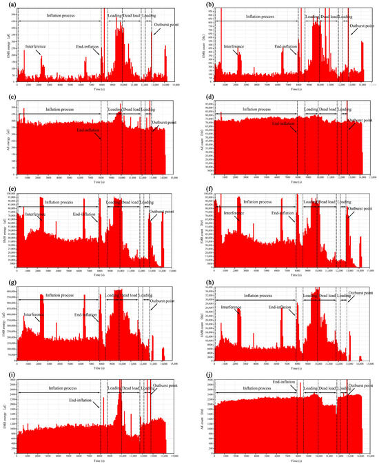The test results of the coal sample gas charging process (0.32 MPa), Channel 1 EMR energy (a) and count (b) (50 KHz), Channel 2 AE energy (c) and count (d) (57.16 KHz), Channel 5 EMR energy (e) and count (f) (25 KHz), Channel 6 EMR energy (g) and count (h) (25 KHz), Channel 8 AE energy (i) and count (j) (20 KHz).
