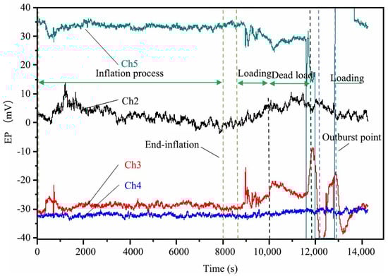 Before a coal mine underground outburst occurs, there are usually variations in stress to some extent. EMR is a kind of electromagnetic wave energy radiated by the coal and rock mass in the process of uneven deformation under the action of load. The laboratory research shows that high stress, crack propagation and gas flow cause the increase in EMR signals [24], which corresponds well with the outburst process of coal and gas. The EMR monitoring method can not only comprehensively characterize the gas, stress, coal-rock fracture process, and other information in front of the working face but also realize the continuous prediction of the evolution process in th coal and gas outburst there. In this section, the experiment tested the pattern of electrical potential signals in gas-bearing coal during the loading process. Overall, the trend in electrical potential signal changes is basically consistent with stress changes. As shown in Figure 7, at 380 , a minor fracture occurred in the coal mass, and due to the fracture, free charges were generated, resulting in changes in various potential channels within the coal mass. Ch5, Ch2, and Ch12 all show varying degrees of increase. As the load continues to increase, the electrical potential signals in all channels change. and are both internal potentials of the coal matrix, and it can be seen that as the load increases during the loading process, the internal coal mass fracturing essentially ends, and the EP signals gradually decrease. Ch12, on the other hand, gradually strengthens with loading. Ch5, with load variations, does not show a very clear trend, but towards the end of the constant load phase, due to the change in the stress state, the signal in channel 5 decreases, and the rate of decrease gradually increases, which is related to the rapid reduction in stress. Ch3 is not far from and both are on the outer surface of the coal matrix. Their trends are consistent, and during the constant load phase, the signal intensity decreases.