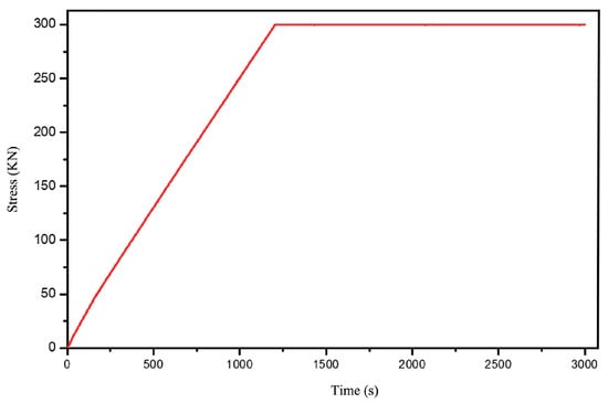 In Figure 3, the period from to 11,750 corresponds to the acoustic–electric signals during the loading process. The stress–strain curve during loading is shown in Figure 5. In this stage, loading is divided into two phases: loading and constant load. The range from to 10,000 represents the loading phase, while 10,000 to 11,750 represents the constant load phase. From Figure 3, it can be observed that during the loading phase, there is good consistency between the EMR signals, AE signals, and the variation in the load as stress increases. During the constant load phase from 10,000 to 11,750 , both EMR and AE signals decrease. In this phase, the force within the coal matrix remains constant, meaning the rate of the load change is zero. During this phase, the acoustic–electric signals are weaker, indicating good consistency between EMR, acoustic emission and the rate of force change. From 12,200 to 12,800 , the second loading phase on the coal matrix is observed. As stress increases, the acoustic–electric signals intensify, but the amplitude is much smaller compared to the first loading phase.