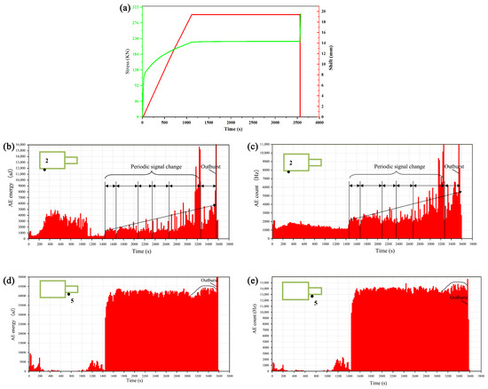 The acoustic–electric pattern testing during the outburst process, Stress–displacement curve (a), Channel 2 AE energy (b) and count (c), Channel 5 EMR energy (d) and count (e).