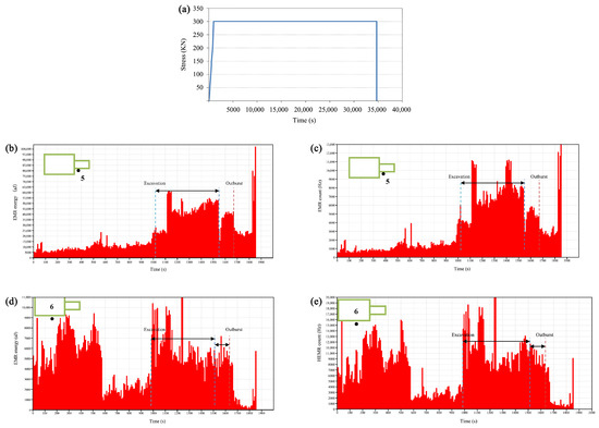 In Figure 8d,e represent Channel 5 for EMR signals. The figure shows that due to significant signal interference, the signal characteristics are not clearly evident during the excavation process.