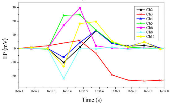 The change in EP signal is a reflection of the internal damage and destruction of the coal body. The differences in the trajectories of EP signal changes indicate that there are variations in the damage and destruction of the coal body near each electrode slice. As analyzed and studied from Figure 10, showing the changes in EP signal at the moment of protrusion under gas pressure, it is known that during the protrusion process, the trend in internal potential change is that the potential value first decreases at the time of protrusion and then rapidly rises. The reason for the decrease is as follows: after the protrusion outlet opens, the stress in the coal body is released, and the gas is discharged. Subsequently, with the development of the coal body protrusion, a large amount of coal breaks, and the breaking of the coal body is accompanied by the separation of charges. The electrons with negative points escape, leaving only positive charges, leading to an increase in potential where the protrusion has occurred. As for the potential at the surface of the coal body, due to the discharge of coal and gas from the protrusion outlet during the protrusion process, accompanied by the rapid discharge of gas and the breaking of the coal body, charge separation occurs, leading to an increase in the EP signal at this location.