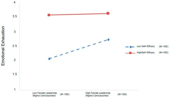 For the moderating effect of self-efficacy, this study conducted a simple slope test. That is, the relationship between female leadership stigma consciousness and emotional exhaustion was tested under different levels of self-efficacy. As shown in Figure 3, female leadership stigma consciousness has a stronger effect on emotional exhaustion in low self-efficacy levels than in high self-efficacy levels. That is, self-efficacy weakens the positive effect of female leadership stigma consciousness on emotional exhaustion.