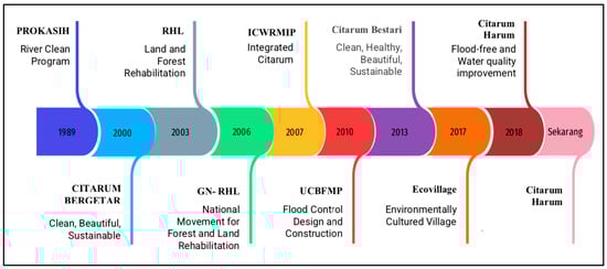 According to [24], the Citarum River restoration program has been conducted since 1989 with the implementation of the Clean River Program (PROKASIH) launched by the Ministry of Environment and Forestry (Figure 1). PROKASIH aims to improve the Citarum River water quality through an industrial and domestic wastewater management scheme. The Provincial Government of West Java, from the year 2000 to 2003, established the Citarum Bergetar Program (clean, beautiful, sustainable). Furthermore, in 2003, the Forestry Agency of West Java enacted five priority policies to restore and maintain the sustainability of forest function through programs for the rehabilitation and conservation of forest resources. Since 2003, the Indonesian government has implemented the National Movement for Forest and Land Rehabilitation program (GN-RHL) to accelerate the implementation of Forest and Land Rehabilitation (RHL). It was established to foster the spirit of RHL as the nation’s moral movement toward accelerating the restoration of the existence and function of forests that improve the community’s welfare.