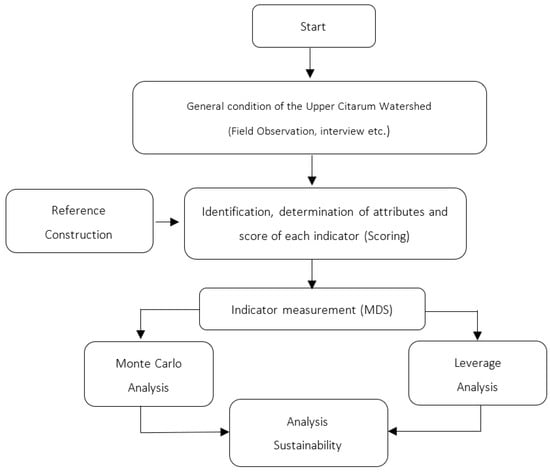 - Identifying and determining the sustainability indicators for ecovillages within the Upper Citarum watershed of West Java Province. This process began by comprehensively examining the prevailing conditions and phenomena within the region, informed by primary and secondary data collected in the field. The identified indicators comprised four distinct dimensions: ecological, economic, social, and cultural. Each dimension is subsequently evaluated through the measurement of its respective attributes.
