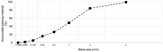 The bio-based insulating aggregate was expanded cork. Therefore, the expanded cork was replaced in different percentages by oyster shell aggregate. The EC was obtained by donation from a cork producing company in Portugal, and its particle size measured 0.5–2 mm. The OSs were obtained by donation from an oyster farmer associated with a cooperative in the Algarve, Portugal. The shells arrived at the laboratory and were cleaned with water, dried at 100 °C for 24 h, and crushed in a cutting mill resulting in a particle size of 0–4 mm, according to Figure 1 [31]. The densities of the natural hydraulic lime, expanded cork, and oyster shells were 758, 52, and 924 kg/m3, respectively. All densities were found according to EN 1097-3 [32].