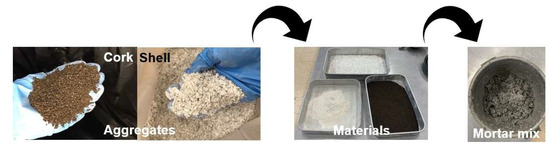 Regarding the production of the mortars, first, natural hydraulic lime and water were mixed. After that, expanded cork and oyster shells were added at the same time. The mixer was used at low and high speeds, and with a pause after all materials were added to the mixture. Mixing the mortars took a total of 3 min and 30 s [33]. The bio-based materials and mortar mix can be seen in Figure 2.
