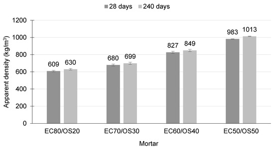 The density of the aggregates can account for the density observed in the mortars. It is evident that as the substitution of EC by OSs increased, the density of the mortars also rose. Notably, the mortar composed of 50% EC and 50% OSs exhibited a density 37% higher than the one with 80% EC and 20% OSs.