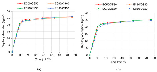 The total volume of water absorbed during the 5760 min testing period was calculated based on the capillary curves depicted in Figure 4a (28 days) and Figure 4b (240 days). These capillary absorption curves clearly illustrate the similarities among the mortars, with somewhat more noticeable differences in the 240-day test due to increased overlap in the curves. In contrast, the EC80/OS20 mortar showed a minor reduction in capillary absorption values at this stage. Towards the final segments of both tests, there’s a tendency for capillary absorption values to stabilize, which is attributed to the saturation of the specimens. This observation leads to the conclusion that the capillary absorption coefficient is predominantly influenced by water absorption during the initial stages of the test for mortars containing expanded cork and oyster shells in their composition.