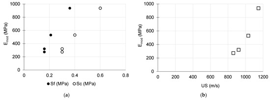 Ratio between dynamic modulus of elasticity: (a) flexural strength (Sf) and compressive strength (Sc); (b) ultra-sound pulse velocity (US).