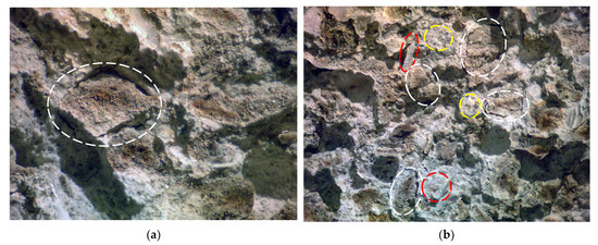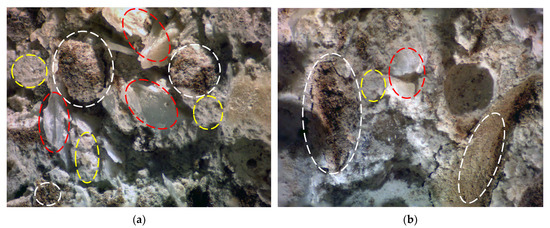 Stereomicroscope: (a) EC80/OS20 (image width of 0.5 mm): EC (white circle); (b) EC70/OS30 (image width of 1 mm): paste (yellow circle); EC (white circle); OS (red circle).