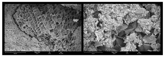 Failures in establishing a strong connection between the paste and the expanded cork and oyster shell aggregates were also evident in the EC60/OS40 mortar. This time, the weak binding was demonstrated through the SEM images, as shown in Figure 9.