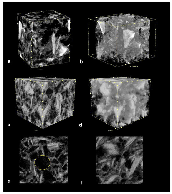 In Figure 10a–f, some illustrative examples of tomographic reconstructions of EC20/OS80 mortar (c, d, and f) and EC50/OS50 mortar (a, b, e) are presented. The most compact parts of the mortar, made up of shell fragments, appear with a lighter colour in the tomographic images. The volumetric differences between the expanded cork aggregate and oyster shells are clearly noticeable. The 3D models in Figure 10a,c provide an overview of the mortars, and the models in Figure 10b,d show the components that are more X-ray opaque (oyster shell—brighter white, and binder—hazy white). In the section of the EC50/OS50 mortar (Figure 10e), it is possible to morphologically identify a spherical pore (yellow circle) in contrast to the darker domains composed of more angular expanded cork fragments, along with elongated oyster shell particles. In the section of EC20/OS80 mortar (Figure 10f), the amount of expanded cork is clearly smaller, and it is difficult to distinguish the interparticle pores due to their reduced size and the extreme porosity of expanded cork (subtle detection of some cellular filling). The results allow for the evaluation of the volumetric quantity and spatial distribution of the components. However, due to the lightweight and cellular nature of expanded cork, it was not possible to determine the interparticle porosity, as happens with other thermal/lightweight mortars [47].