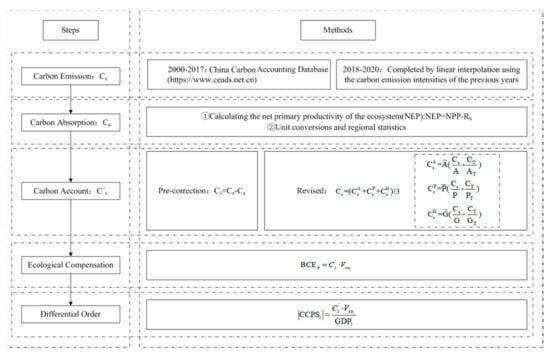 where GDPi is the GDP of place I, V c o 2 is the unit price of carbon, and |CCPSi| is the corrected ecological compensation differential order for region i. The magnitude of the |CCPSi| value represents the importance of ecological compensation funds to the region. When a place has a carbon surplus area, it should be compensated, and at the same time, CCPSi < 0 indicates that the place is in urgent need of eco-compensation funds, and at this time, the smaller the value of CCPSi, the higher the order of being compensated. When a place is a carbon deficit area, the funds should be paid, and at the same time, CCPSi > 0. The larger value of CCPSi indicates that the payment of eco-compensation funds has a larger touch on the local area, and at this time, the larger the CCPSi is, the more the order of payment is.