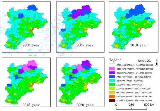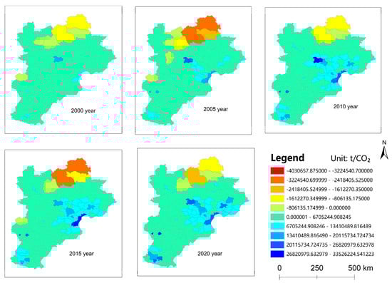 The corrected spatial and temporal characteristics of carbon accounts are shown in Figure 4. Overall, the distribution of carbon accounts in Beijing–Tianjin–Hebei from 2000 to 2020 still shows the distribution trend of “low in the north and high in the south”, but the gap between the counties is significantly narrowed, and the spatial distribution of carbon accounts is more even. The northern part of the Beijing–Tianjin–Hebei region is the main carbon sequestration area, the southern part is the carbon emission area, and the Binhai New Area in the centre is the main carbon account peak area. In the northern part of the region, there is a trend of “decreasing first and then increasing”; the counties around Zhangjiakou City and Luanping County show a trend of gradual increase; in the central part of the region, the highest value of the carbon account is always located in the Binhai New Area; in the southern part of the region, there is a trend of “increasing first and then decreasing” in the carbon account as a whole, but Shijiazhuang City and its municipal districts show a steady increase.