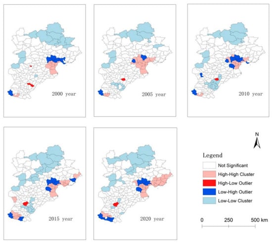 As shown in Figure 5, the spatial distribution of the ecological compensation amount from 2000 to 2020 has obvious spatial and temporal heterogeneity. Specifically, the northwestern region displays a low–low aggregation concentration, while the eastern region demonstrates a high–high aggregation concentration. In the southern region, there is a sporadic distribution of individual low–low aggregation areas and low–high aggregation areas, and the aggregation areas have been expanding to varying degrees over time. In 2000, the low–low aggregation area was 13 counties, including Weichang County, Longhua County, and Fengning Manchu Autonomous Region; the high–high aggregation area was eight counties, including Huanghua City, Binhai New Area, and Jinghai County; and the low–high aggregation area was six counties, including Baodi County, Ninghe County, and Fengnan City, which had low ecological compensation, while their neighbouring counties had high ecological compensation. In 2005, the low–low aggregation zone reduced the number of counties in Luanping and Chengde and increased the number of counties in Longyao and Julu, bringing the total to 15 counties. The high–high aggregation area added Ninghe and Fengnan counties, bringing the total to 15 counties. The low–high aggregation area reduced the counties of Ninghe and Fengnan and added Yongqing County to bring the total to three counties. In 2010, compared to 2005, the low–low agglomeration area decreased in the Kuan Cheng Manzu Autonomous Region and increased by eight counties, including Luanping and Xinhe, bringing the total to 22 counties. The low–high aggregation area increased by five counties, including Wuqiang and Ninghe, to eight counties. The high–high aggregation area reduced the counties of Jinghai, Wuqing, and Ninghe to nine counties. In 2015, compared to 2010, the low–low aggregation area was reduced by eight counties, including Wuqiang County and Wuyi County. The low–high aggregation area reduced Yongqing, Luquan, and Luannan counties and added Changli, Luannan, and Linzhang counties to bring the total to eight counties. The high–high aggregation area reduced Xianghe County, Luannan County, etc., and added eight counties, including Funing County. In 2020, compared with 2015, the low–low aggregation area reduced counties such as Miyun and Qinghe and increased Xinji and Zhangbei counties to bring the total to 17 counties. The low–high aggregation area reduced Changli County and increased Magnet County to eight counties. The high–high aggregation area reduced Jingxing County and Ci County and added six counties, including Lulong County and Luan County, to bring the total to 18 counties.