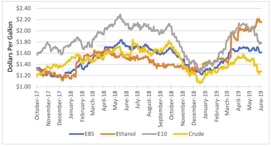 The fuel and ethanol data used in this study comprise daily observations from a large market in the southern United States and cover the time period from 9 October 2017 to 11 June 2019. This market resides in an area that, based on the number of energy firms present, employment in energy-related fields, and volume of energy products flowing in and out of the region, is considered the largest energy market in the United States and, therefore, a strong representative sample for this study. These prices were sourced from the Oil Price Information Service (OPIS) wholesale rack for that city. The OPIS wholesale rack prices are not available on Sunday, so any price changes estimated on a Monday would reference the previous Saturday’s price. Daily crude oil prices expressed as the spot price of West Texas Intermediate crude (WTI) were matched by date to the OPIS data and were obtained from the U.S. Energy Information Administration (EIA). The WTI crude prices are the benchmark in the United States and the leading global crude oil value indicator [21].
