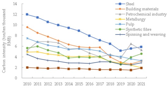 Carbon emission intensity reflects carbon productivity, and the carbon emission intensity of the eight major industries in the Zhejiang Province shows a downward trend (Figure 3), and the carbon emission intensity declined more significantly in 2010–2019, indicating that the Zhejiang Province has made some progress in terms of energy efficiency and energy structure transformation, but some industries showed a slow upward trend after 2019, which may be due to the impact of the COVID-19. This has led to a partial deterioration of the economic development level of some industries, and an increase in the carbon emission intensity of others. Among the eight industries, the iron and steel industry has the highest carbon emission intensity, i.e., the lowest carbon emission efficiency, with an average annual carbon emission intensity of 8.37 t/million CNY; the electric power industry has the lowest carbon emission intensity and the highest carbon emission efficiency, with an average annual carbon emission intensity of 1.76 t/million CNY; which suggests that the electric power industry has a higher quality of economic development, whereas the iron and steel industry has a worse quality of economic development. From 2010 to 2021, the carbon emission intensity of the building materials industry decreased the most, reaching 66.28%; the carbon emission intensity of the petrochemical industry decreased the least, by −2.22%. Therefore, in the future, the Zhejiang Province should focus on the energy consumption of the petrochemical industry and promote the low-carbon transformation of the petrochemical industry.