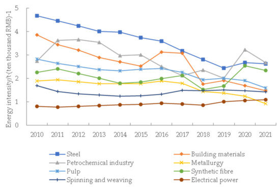 Energy consumption intensity of eight high-carbon industries in the Zhejiang Province from 2010 to 2021.