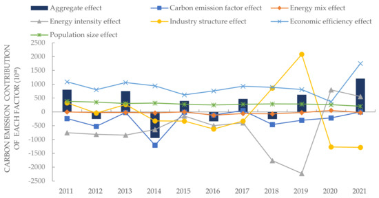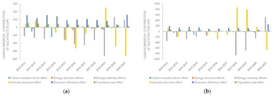 Since 2010, the carbon emission coefficient effect has made a non-negligible contribution to carbon emission reduction, and the carbon emission coefficients have always inhibited carbon emissions. The carbon emission coefficients of energy in the eight major industries in the Zhejiang Province follow the carbon emission coefficients stipulated in the IPCC report, in which the carbon emission coefficients of fossil energy sources, such as coal-based, oil-based and natural gas, are unchanged, whereas electricity and heat belong to the secondary energy sources, and thus the carbon emission coefficients change every year depending on the process technology and the type of energy source used. In recent years, China has been vigorously developing new power systems based on new energy sources, and although China is still dominated by thermal power generation, the proportion of hydropower, wind power, nuclear power, and solar photovoltaic power generation is increasing, in addition to the proportion of self-generated and self-consumed electricity in industrial parks in the Zhejiang Province. In June 2021, the Development and Reform Commission of the Zhejiang Province issued the ‘Renewable Energy Development’ report, which states that the total amount of new wind and solar energy generated in the Zhejiang Province is planned to increase from 17 million kilowatts in 2020 to 34 million kilowatts in 2025. This plan will also play an important role in carbon emission reduction in the industry in the Zhejiang Province.