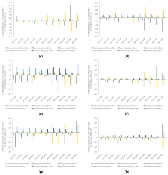 Relative contribution of various drivers of carbon emissions in eight high−carbon industries in the Zhejiang Province from 2010 to 2021 [38].