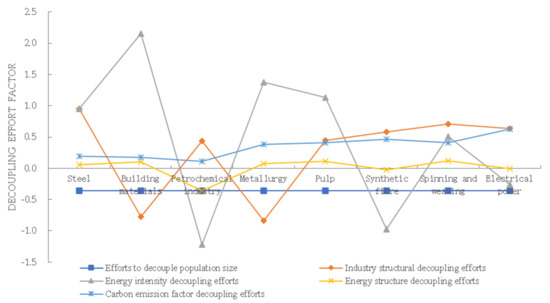 With regard to the carbon emission factor effect, during the study period, the carbon emission factor effect made decoupling efforts for all eight industries, among which the power industry had the highest value of decoupling efforts, mainly due to the fact that the power industry consumes the largest amount of electricity, and the carbon emission factor effect is changed mainly because of the different ways of generating electricity. In recent years, China’s wind power, photovoltaic, hydropower and nuclear power and other clean energy power accounted for an increasing proportion of the total, so the carbon emission coefficient effect has a significant decoupling effort.
