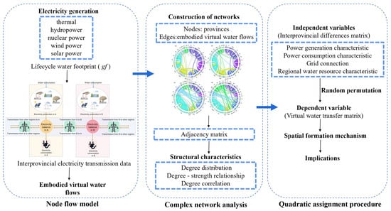 In order to make link and flow predictions for future food-related virtual water networks, Lü and Zhou [] developed a network similarity algorithm to model topological networks. The gravity model has also been widely used for virtual water driver identification and network flow modeling []. However, research on the spatial formation mechanisms of virtual water networks for electricity trade is currently inadequate. The logarithmic Mean Divisia Index (LMDI) [] and Structural Decomposition Analysis (SDA) [] are the main methods used in the existing literature to investigate the drivers of the evolution of electricity-related virtual water flows over time. These two methods are limited when analyzing socio-environmental factors, as the drivers they examine depend on the virtual water accounting formula. The Quadratic Assignment Procedure (QAP) is a method to investigate the driving factors of trade networks depending on relational data (mutual relationships between nodes in the network) []. Based on the matrix substitution test, the QAP can solve the problem of multicollinearity between independent variables that cannot be handled by the traditional OLS and provides a new perspective for analyzing the spatial formation of a virtual water network.