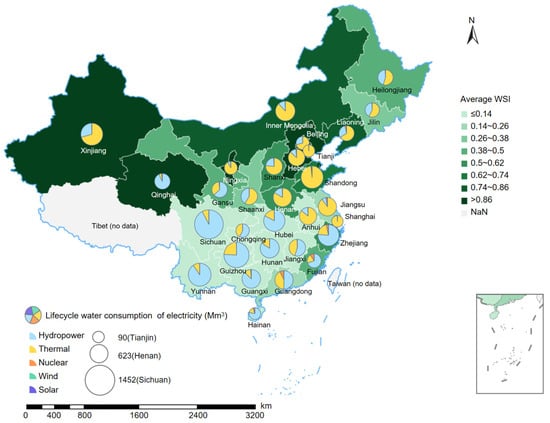 Distribution of electricity-related water consumption and average WSI at the provincial level in 2020. The circles in the legend represent the relative size of total water consumption of five electricity technologies.