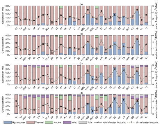The hybrid water footprint of each province was mainly influenced by the generation structure. As illustrated in Figure 4, provinces with higher hydropower share had a relatively large hybrid water footprint, such as Sichuan (4.65 m3/MWh), Yunnan (4.34 m3/MWh) and Qinghai (4.02 m3/MWh). In addition, certain eastern provinces with a flat topography had a much larger hydropower water footprint than western provinces [] with a low hydropower share but a large hybrid water footprint, e.g., Beijing (4.01 m3/MWh) and Heilongjiang (3.12 m3/MWh).