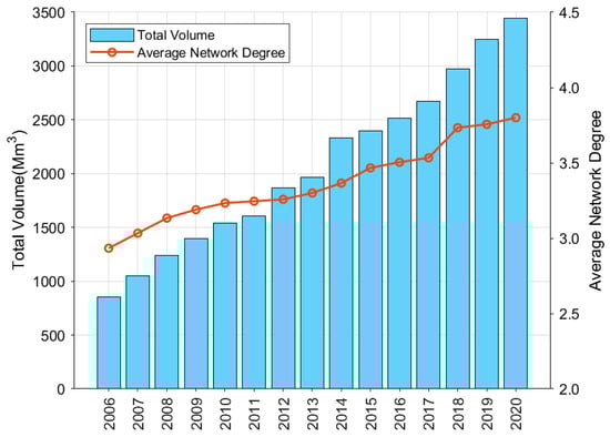 Based on the node flow model, we constructed virtual water transfer networks for interprovincial electricity trade from 2006 to 2020. With the expansion of the cross-regional interconnected power grid, the mean number of electricity trade partners (network average degree) grew from 2.9 to 3.8 for each province during the study period (Figure 5). The total virtual water volume rose from 851.24 Mm3 to 3441.58 Mm3, associated with a 3.63-fold increase in the interprovincial electricity transmission capacity. Furthermore, we visualized the virtual water network (Figure 6) with the Circos tool to analyze its structural evolution. The flexibility of virtual water network links for electricity trade is relatively small due to the limitations of the grid infrastructure [], with little change in the overall trade structure. The three major paths of virtual water transfer were Hubei and Sichuan to the Yangtze River Delta, Guizhou and Yunnan to Guangdong, and Inner Mongolia and Shanxi to Beijing–Tianjin–Hebei.