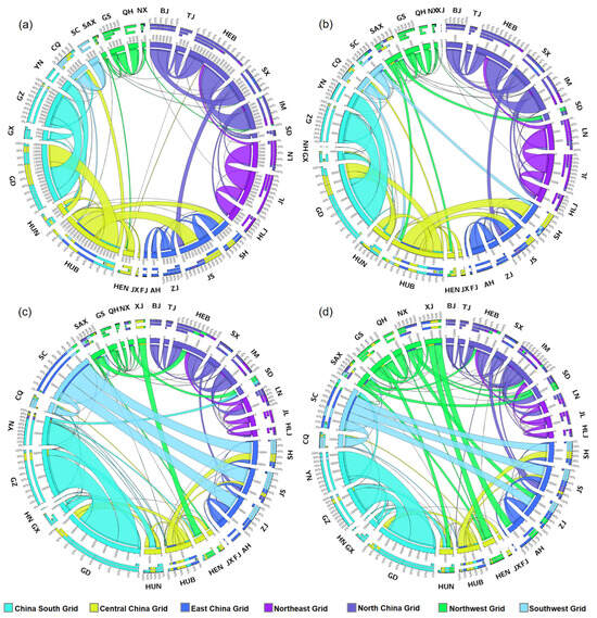 Interprovincial virtual water transfer network of power trade in: (a) 2006, (b) 2010, (c) 2015, (d) 2020 (unit: 104 m3). The ribbon directly connected to the inner ring indicates exported virtual water, while the ribbon with a gap in the inner ring indicates imported virtual water.