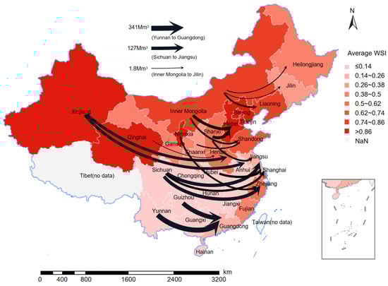 With the construction and operation of the West–East Electricity Transmission Project, coal, wind and solar power from the North China and Northwest grids is delivered to the Beijing–Tianjin–Hebei urban agglomeration, and hydropower from the southwest grid is delivered to the Yangtze River Delta (Jiangsu, Zhejiang and Shanghai) and Guangdong. It is worth noting that electricity-related virtual water transfers are intensifying freshwater shortages in the exporting regions. The current spatial virtual water flow pattern is unsustainable, especially for the northwest region with a high WSI, which deserves our attention in the context of coordinated energy and water resources utilization.