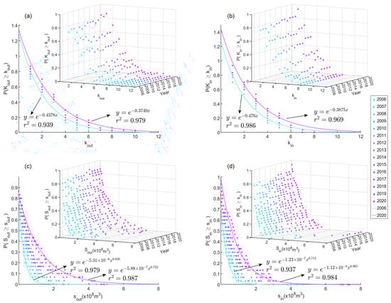 Cumulative distribution of virtual water networks of interprovincial electricity trade in China from 2006 to 2020. The two-dimensional graph is projected from the three-dimensional graph of: (a) Out-degree of nodes, (b) In-degree of nodes, (c) Out-strength of nodes, (d) In-strength of nodes.