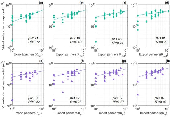 The change in node strength with node degree follows a power law relationship (Figure 9). and , which is similar to the characteristics of the European electricity trading virtual water network []. This power law relationship suggests that the volume of electricity-related virtual water exchange is growing much faster than the number of trading partners, and active nodes with plenty of electricity interconnections with other provinces participate in virtual water transfers in a highly non-linear manner. In addition, the function of the virtual water exchange volume and trade connectivity varies depending on the trade direction. The slope of the import relationship increases over time. Provinces with a high electricity demand, such as Zhejiang, Jiangsu and Guangdong, have introduced considerable quantities of virtual water by expanding their import sources, which has effectively alleviated their local water pressure. In contrast, the slope of the export relationship decreases over time, suggesting that power exporters have reached the limit of the number of export partners to increase virtual water exports [].