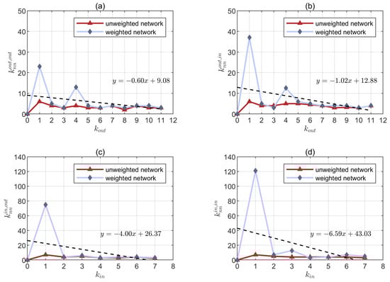 Networks with the same degree distribution may have different properties and behaviors. To further investigate the higher-order topological features of virtual water network, we applied the average nearest-neighbor degree () to portray the degree correlation []. identifies all neighbors of node i, then sums the respective degrees of the neighbors and finally performs normalization according to the degrees of node i. The of a directed network can be classified as , , , . The first element in the superscript determines the neighborhood of node i, and the second element marks the direction of neighbor’s node degree (Equation (9)).