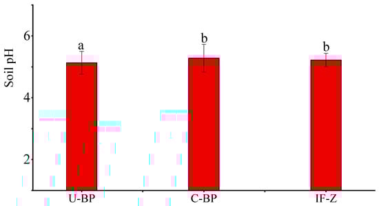 Soil pH under U-BP, C-BP, and IF-Z. U-BP stands for uncut black pine; C-BP stands for cut black pine; IF-Z stands for the inter-forest zone. Different letters (a, b) over the columns indicate significant differences among the three groups in terms of soil pH (t-test, p < 0.05).