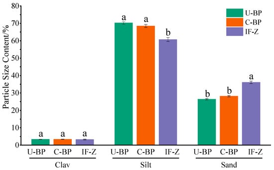 The content of clay under C-BP was greater than that of soil under U-BP and IF-Z. Additionally, the clay content under U-BP was higher than that of IF-Z (Figure 2 and Figure 3). However, there was no significant difference in clay content among the three environments (LSD, p > 0.05). The characteristics of the silt content differed from that of clay. The soil silt content of IF-Z was lower than that of U-BP and C-BP (Figure 2 and Figure 3). The characteristics of the sand content (including very fine, fine, medium, and coarse sand) revealed that the soil sand content under U-BP and C-BP was lower than that of IF-Z (Figure 2 and Figure 3). The ANOVA showed that there was no significant difference between the first two, but both were significantly lower than the soil silt content of IF-Z. This trend was opposite to the characteristics of clay and silt.