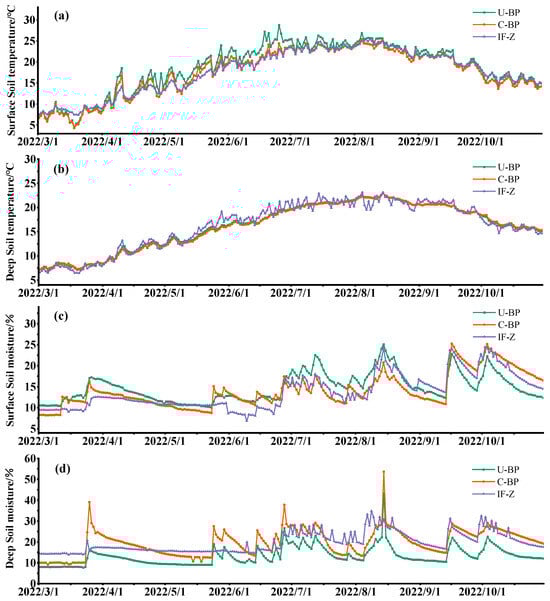 (a) Daily surface soil temperature, (b) daily deep soil temperature, (c) daily surface soil moisture, and (d) daily deep soil moisture. U-BP stands for uncut black pine, C-BP stands for cut black pine, and IF-Z stands for the inter-forest zone.
