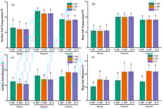 (a) The surface soil temperature, (b) the deep soil temperature, (c) surface soil moisture, and (d) the deep soil moisture. U-BP stands for uncut black pine, C-BP stands for cut black pine, and IF-Z stands for the inter-forest zone. Different letters (a, b) over the columns indicate significant differences among these groups in terms of surface soil temperature, deep soil temperature, surface soil moisture, and deep soil moisture in spring, summer, and autumn (t-test, p < 0.05).