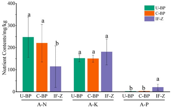 For A-N, the content for U-BP, C-BP, and IF-Z was 247.26 ± 91.19, 220.40 ± 85.27, and 114.31 ± 94.17 mg·kg−1, respectively. The results of ANOVA showed that there was no significant difference in the soil A-N content between U-BP and C-BP, although they differed by 26.86 mg·kg−1, and both were significantly higher than that of IF-Z (Figure 6). On the other hand, the results for A-P showed the opposite trend. The A-P content for U-BP, C-BP, and IF-Z was 2.29 ± 0.71, 2.86 ± 0.52, and 20.67 ± 13.87 mg·kg−1, respectively. There was no significant difference in soil A-P content between U-BP and C-BP, but they differed by 0.57 mg·kg−1, and both were significantly lower than that of IF-Z. The characteristics of A-K content differed from those of A-N and A-P. The A-K content in soil under U-BP, C-BP, and IF-Z were 151.73 ± 15.89, 150.05 ± 15.94, and 180.53 ± 58.59 mg·kg−1, respectively, with no significant difference among the three.
