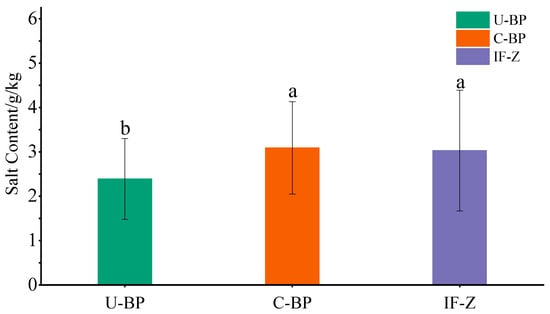 The results of experiments to determine the salt content and ANOVA showed that there was no significant difference in the soil salinity between C-BP and IF-Z (Figure 7). The salinity of IF-Z, C-BP, and U-BP was 3.03 ± 1.36, 3.09 ± 1.04, and 2.39 ± 0.91 g·kg−1, respectively, indicating a moderate level of salinization. However, both were significantly higher than that of U-BP by 0.7 and 0.64 g·kg−1, respectively. The levels of soil salinization under IF-Z and C-BP were slightly higher compared with U-BP.