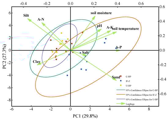 The effects of infected wood removal on the soil’s physicochemical properties were analyzed using principal component analysis (PCA) based on data from the three plots. The analysis considered soil temperature, soil moisture, pH, particle size distribution (clay, silt, sand), nutrient content (A-N, A-K, A-P), and salinity (Figure 8). The PCA ranking plot showed the relative distance between the sampling points, representing the similarity of the samples []. PC1 and PC2, established through PCA analysis, represent two theoretical variables. The percentages in parentheses indicate the interpretation rate of the soil’s physicochemical properties for each theoretical axis. PC1, accounting for 29.8% of the interpretation rate, determined the soil temperature and the horizontal distribution characteristics of the physicochemical properties. PC2, mainly influenced by soil moisture, accounted for 27.3% of the interpretation rate, representing the vertical distribution characteristics of the physicochemical properties. The distribution of the U-BP samples was the most concentrated, indicating higher similarity among the samples. On the other hand, the IF-Z samples showed a more scattered distribution, indicating greater differences among the sampling points. The overlap between U-BP and C-BP samples was higher, suggesting greater similarity between these two samples. Moreover, the similarity between IF-Z and C-BP was significantly greater than that between IF-Z and U-BP, indicating that the soil physicochemical properties of C-BP were closer to those of IF-Z than to those of U-BP.