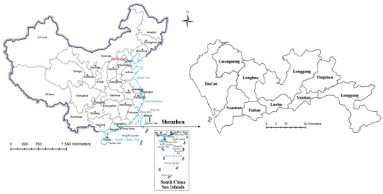 The data are processed, organized, and summarized by using the software ArcGIS 10.2. The number of each sub-category for POI in each district and all districts is calculated by using ArcGIS. The geographical position of Shenzhen in China is shown in