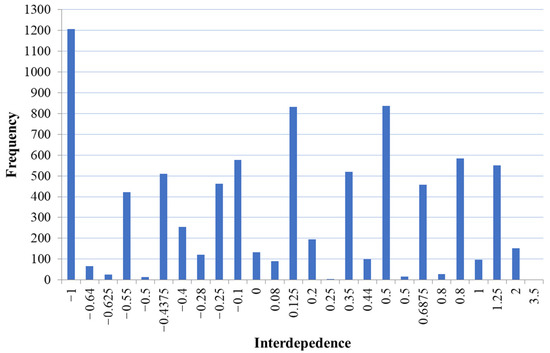 take up 54.05%, exceeding half of the total. For the negative interdependences, 1878 values of the indices are in the range of −0.5 to −0.75. Also, 1207 values are equal to −1. It is shown that most negative interdependence indices are relatively strong. There are 1207 values of the indices with strong negative