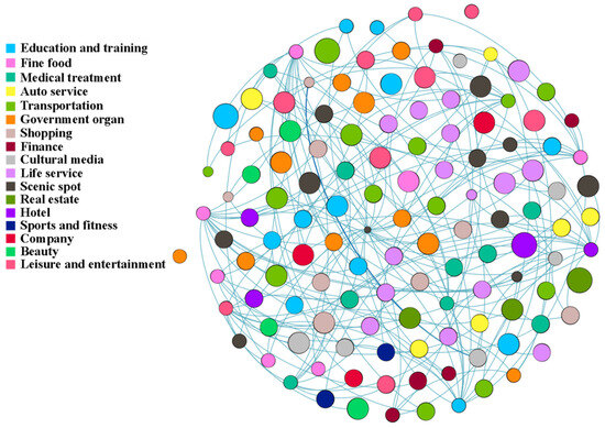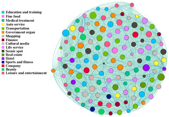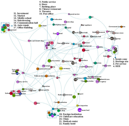53]. Especially, scenic spots need more convenient and complete transportation services to attract more visitors. Leisure and entertainment, life services, shopping, and fine food are gathered to form a commercial area or commercial-based comprehensive cluster, which can improve the construction of a combination of residence and commerce and promote the economic development of the city. Medical treatment, education and training, and government organs are closet, and these can develop public utilities and services, such as education, science and technology, and health, and government agencies to ensure the public’s participation in socio-economic, political, and scientific activities and promote Shenzhen to be an international science and technology center, industry innovation center, and comprehensive national science center. Finance, life services, shopping, real estate, auto services, education and training, and beauty are highly clustered, which can create the employment center and reduce the unemployment rate, as well as enhance the consumption services and educational services around the employment center.