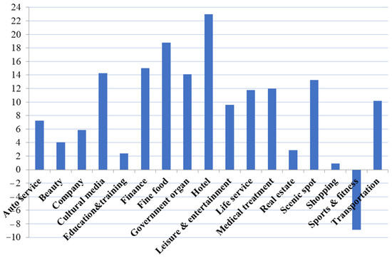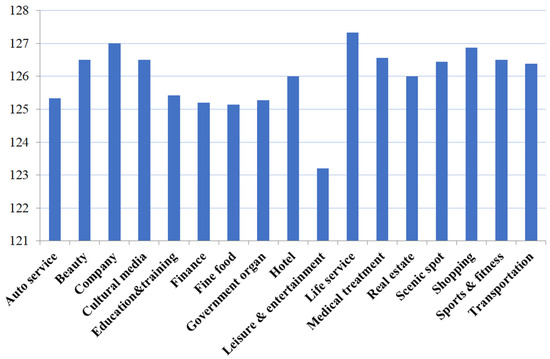 Figure 8, the functions with the highest average weighted degree are hotel and fine food, showing that the spatial agglomeration distribution trend of these two categories of urban functions is the most obvious; finance, cultural media, government organs, and scenic spots take second place; and the agglomeration trend of sports and fitness and shopping is weak.