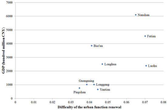 Figure 10, Luohu District has the highest value of the difficulty of the urban function renewal, while there is the lowest value of that in Pingshan District. It is shown that Luohu is easier to renew its urban functions, and Pingshan is more challenging to renew urban functions. The districts with higher GDP have greater values of the difficulty of the urban function renewal. For example, Nanshan District has the highest GDP of 6103.6866 hundred million CNY, and its value of the difficulty of the function renewal is 0.065, which is relatively high among all the districts. Pingshan has the lowest GDP of 760.87 hundred million CNY, and its value of the difficulty of the urban function renewal is 0.0346, which is the weakest among all the districts. Thus, the district with a better economic level can easily renew its urban functions.