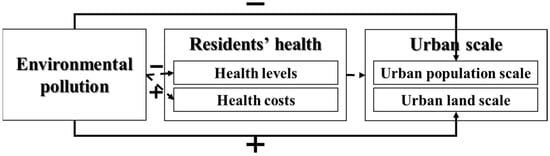 Additionally, the contributions of this paper are as follows: First, previous studies on the impact of pollution on the urban scale generally focused on a specific measure of pollutants or an urban scale, such as haze pollution [13,14] and population scale [15,16,17]. However, few studies have considered the heterogeneity of such impacts. However, different pollutants and their sources will have differentiated effects on urban populations and land use [18], which merits further exploration. Additionally, the single proxy for urban scale and the ignorance of urban built-up land expansion may be against Chinese land-dominated urbanization as a result of dualistic land experienced by most Chinese cities [19]. Therefore, relying solely on the urban population does not accurately reflect the scale of the city. Given these, this paper analyzes the heterogeneous impacts of pollution on the urban scale in China at the city level based on the effects of various emissions on both the urban population scale and the urban land scale. Second, although environmental pollution has been studied extensively with respect to its health effects, limited research has simultaneously identified the logical chain or examined the relationship among environmental pollutants, resident health, and urban scale. Therefore, this study attempted to bridge these concepts by validating the mechanisms underlying residents’ health in terms of environmental pollution and urban scale. Using city-level data, the mediation effect empirical method was applied based on the theoretical model. This paper attempts to clarify the logical chain among pollution, health, and urban scale by identifying the mediating role of human health in the nexus between environmental pollution and urban scale from the aspects of urban residents’ health levels and health costs. In short, this study establishes an innovative and relatively comprehensive analytical framework for probing into the effects and mechanisms of environmental pollution on an urban scale.