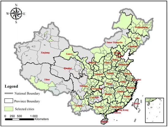 In response to a reviewer’s comments, the map of the cities analyzed in this study (i.e., Figure 3) was provided for visualization for ArcGIS application with the help of Jie Wang (a lecturer at China University of Geosciences, Beijing) for which the authors are very grateful.